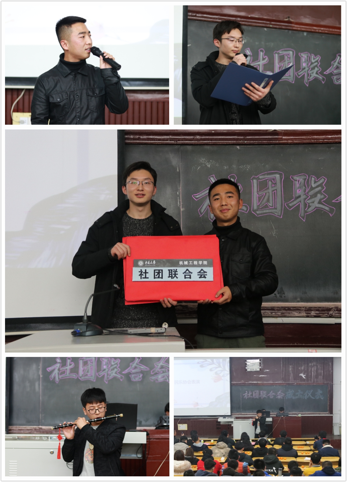 伴随着共青团歌大会拉开序幕,播放了记录着机械工程学院各个社团风采的短片,一张张朝气蓬勃的脸展示着各学生社团的昂扬向上的风貌。机械工程学院社团联合会主席陈奇的发言,表明了对于带领社团联合发展的信心和决心。歌手协会和民乐协会的表演人员毫无保留的施展着自己的才华,为在场老师同学带来了一场音乐盛宴。紧接着,由社团代表张华同学为我们讲述了社团带给学生们的帮助,让我们感受到社团联合发展的必要性。会议期间,乐说协会的喜剧成员带来的小品幽默诙谐,带给在场的观众无限欢乐,活跃的气氛温暖了冬夜的寒冷。院学生会主席杜家辉的即兴演唱带动了全体观众的情绪,雄浑的声音将这次仪式推向高潮。最后,学生科车建伟老师发表大会总结,为各社团负责人颁发聘书,并代表机械工程学院为社团联合会授牌。本次仪式正式落下帷幕。