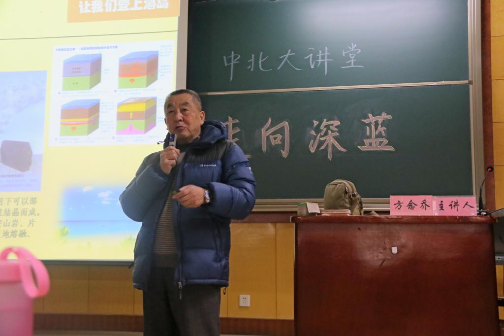 12月9日,由学生工作处主办,机械工程学院与软件工程学院承办的第114期中北大讲堂于09102教室举行。大讲堂邀请到中国地质大学博士生导师方念乔教授走进中北,为我校师生带来一场以“认识海岛,走进深蓝”为主题的知识盛宴。方念乔教授曾任国土资源部岩石圈构造和动力学开发实验室主任、中国地质大学海洋地学研究中心主任以及中国地质大学海洋学院院长。曾获中科院自然科学一等奖,发表学术论文100余篇,在海洋学方面有着很深的造诣。