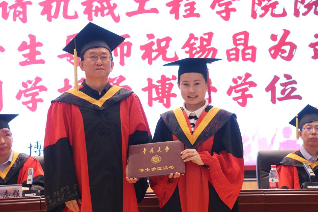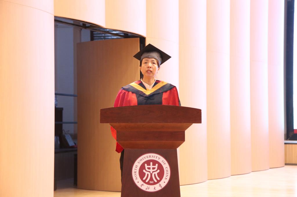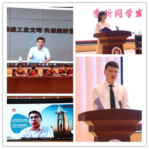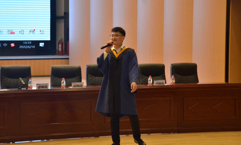 随后院党委书记张清宣读了2022届校级优秀毕业生名单,副院长苗鸿宾宣读了2018级学业领航学长和企业领航学长的名单,副院长曾志强宣读了2022届校友联络员的名单,并由主席台老师为获奖学生、受聘学生颁发荣誉证书与聘书,并赠送学院纪念品。颁奖环节结束后,会场现场连线杰出校友代表深圳市汇川技术股份有限公司副总裁杨春禄,为毕业生送上鼓励,他希望毕业生找到自己真正热爱的工作岗位,并潜心钻研,在工作中真正做到致知于行,取得新的突破。之后,研究生毕业生代表丁培燎、本科毕业生代表李昕分别发言,他们诉说了自己的成长历程,向培养自己的学院与老师致以崇高的感谢,并会谨记院训,朝着美好的未来稳步前进。之后教师代表、本硕博均毕业于中北大学机械工程学院的叶林征老师发言,他向全体毕业生提出几点建议,要率真存厚,在寻真、求真的路上坚持到底;要立志有恒,在服务国家重大需求中磨砺才干;要砥砺奋斗,珍惜时光努力学习。典礼第一部分的最后,由学院院长祝锡晶发表毕业致辞,祝院长首先向顺利毕业的学院765名本科生、129名研究生表示祝贺,随后祝院长回顾了学院过去几年取得的成就,对同学们参与见证并付出努力表示肯定与赞扬。祝院长寄语即将毕业的同学们:要做胸怀天下、矢志报国的进步青年,同时叮嘱毕业生们要沉下心来做事,做自己人生的“工匠”,勇敢面对各种挑战,让青春之光照耀星辰大海。