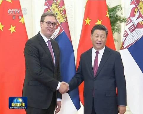 国家主席习近平18日在人民大会堂会见来华出席夏季达沃斯论坛的塞尔维亚总统武契奇。