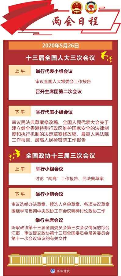 新华社北京5月25日电 十三届全国人大三次会议26日上午举行代表小组会议,审议全国人大常委会工作报告;11时召开主席团第二次会议。下午举行代表小组会议,审议民法典草案修改稿、全国人民代表大会关于建立健全香港特别行政区维护国家安全的法律制度和执行机制的决定草案修改稿、最高人民法院工作报告、最高人民检察院工作报告。