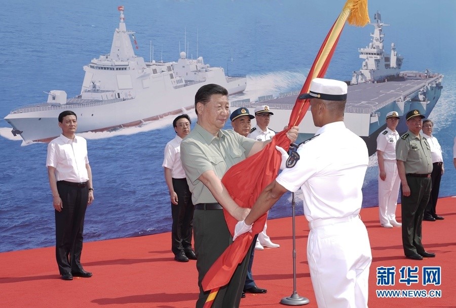 4月23日,海军三型主战舰艇——长征18号艇、大连舰、海南舰在海南三亚某军港集中交接入列。中共中央总书记、国家主席、中央军委主席习近平出席交接入列活动并登上舰艇视察。这是习近平向海南舰授予军旗、命名证书。