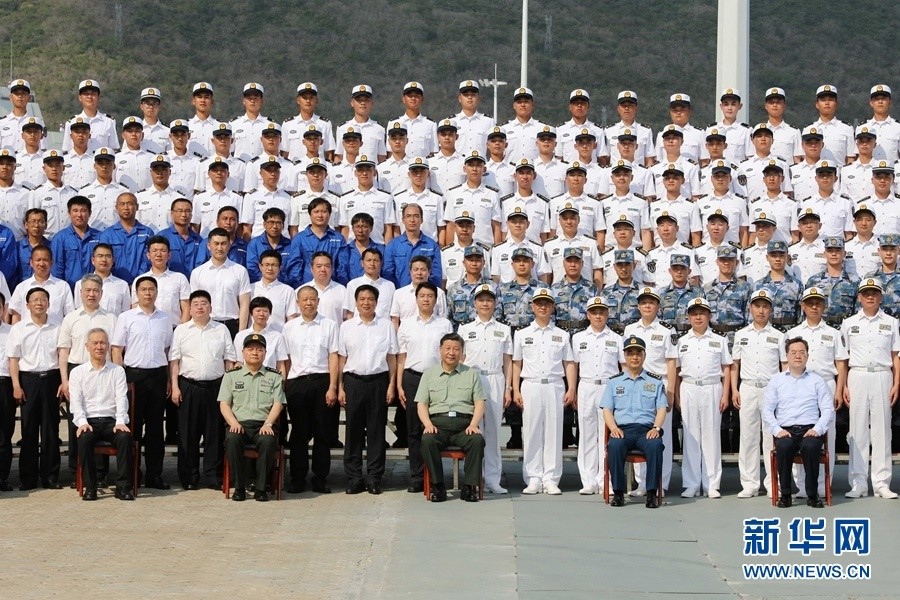 4月23日,海军三型主战舰艇——长征18号艇、大连舰、海南舰在海南三亚某军港集中交接入列。中共中央总书记、国家主席、中央军委主席习近平出席交接入列活动并登上舰艇视察。这是习近平亲切接见舰艇科研生产人员和海军部队官兵代表。