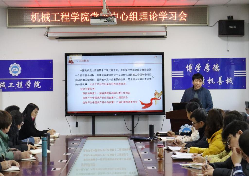 本次学习会以院领导讲授专题党课形式开展,副院长曾志强同志领学了中国共产党山西省第十二次代表大会精神。首先,曾志强同志介绍了大会的总体情况,并强调了这次大会的重要意义。中国共产党山西省第十二次代表大会,是在我们实现全面建成小康社会第一个百年奋斗目标,向着全面建成社会主义现代化强国第二个百年奋斗目标迈进的关键时刻,召开的一次十分重要的会议,是全省人民政治生活中的一件大事。随后曾志强同志从九个方面紧紧围绕中共山西省第十二次党代会主题,全面解读了工作报告、大会成果和中共山西省委第十二届一次全会精神,重点从山西未来区域发展规划和转型发展进行了讲解。他强调广大师生应把学习宣传山西省第十二次党代会精神作为当前和今后一个时期重要政治任务,要坚持学以致用,进一步把会议精神贯彻落实到学院工作全过程各方面,助力中北大学、太忻经济区高质量发展。