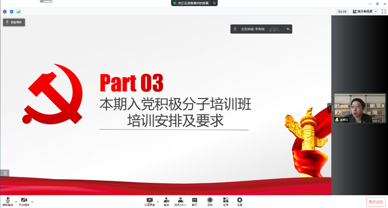 本次院党课培训,虽受疫情影响在线上进行,但丝毫没有降低学员们学习理论知识的热情,各学员也积极遵守要求,全程打开摄像头,相互监督、相互交流,形成了良好的学习氛围。通过本次培训班的学习,对学员们系统学习党的基本理论知识、明确党员的权利和义务、端正入党动机、坚定理想信念有着重要推动作用。相信学员们一定会在以后的学习、生活中牢记理想信念,在学院建设发展中起到示范作用、带头作用和骨干作用,真正体现新时代青年的担当和作为!