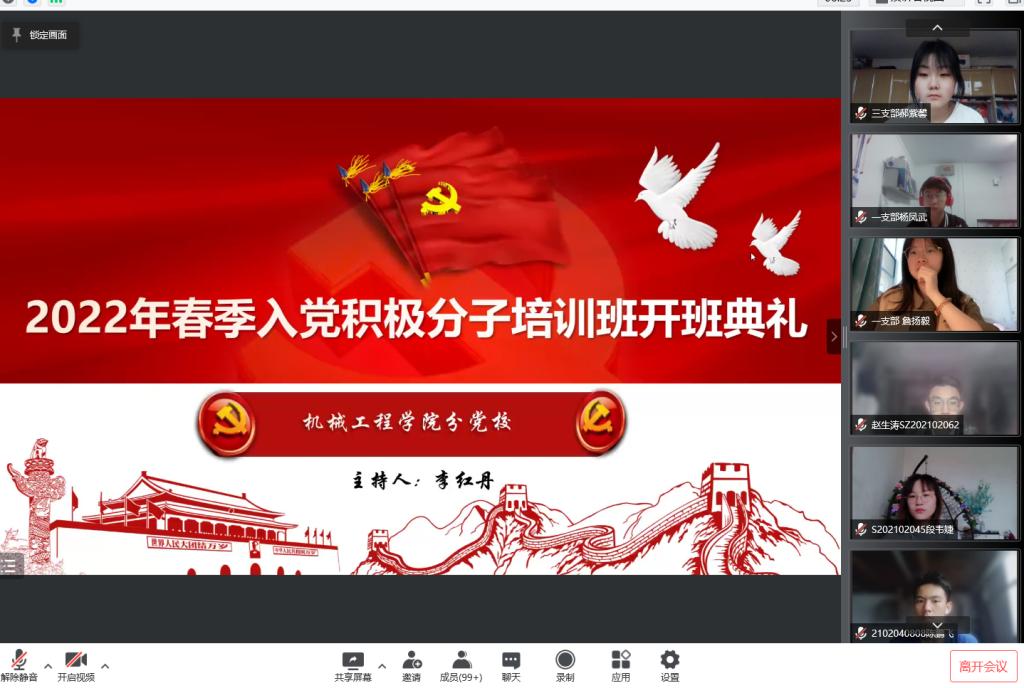 为了进一步做好学院分党校2022年春季入党积极分子培训班培训工作,进一步提升入党积极分子的党性修养,端正入党动机,坚定理想信念,2022年5月7日至5月8日,机械工程学院党委举办2022年春季入党积极分子培训班,由于疫情原因,本次开班典礼和培训授课均采用线上方式进行,学院142名入党积极分子参加了此次培训。