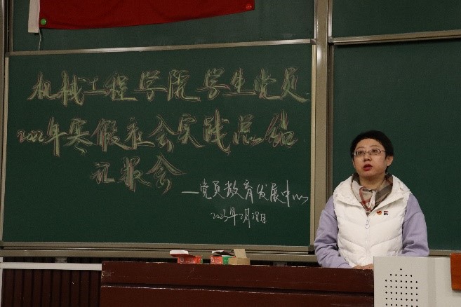 2023年2月28日下午4时,机械工程学院学生党员教育发展中心于07103教室举办2022年党员寒假社会实践总结汇报会。院党委副书记李秀玲、学生科科长王子威、院团委书记王瑾、院团委副书记苗慧,各支部书记出席了本次活动。