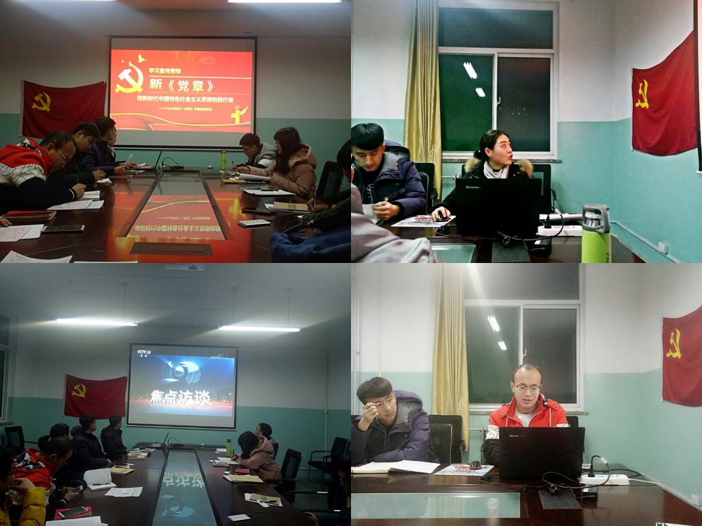 会上主要就十九大召开以来对党章修改之处进行了集中学习,主要从习近平新时代中国特色社会主义思想;习近平总书记在党中央在全党的核心地位;习近平总书记治国理政新理念新思想新战略;党的十八大以来全面从严治党的理论成果,制度成果四个方面进行学习。各小组通过PPT和视频讲解的方式使同志们对于新党章有了更深刻的理解。