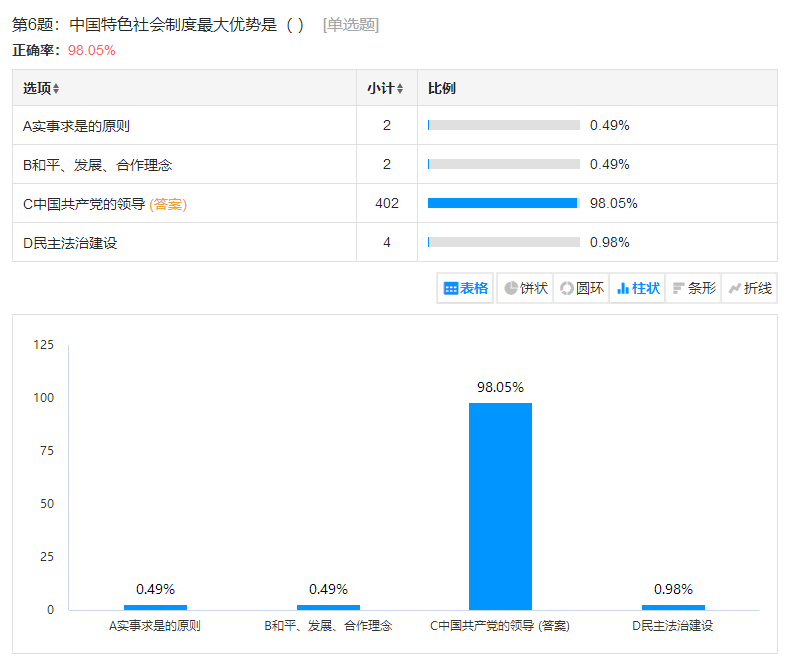 本次专项答题活动在全院积极分子、发展对象、预备党员及党员中开展,截至4月26日,全院各学生党支部共组织参与专项答题活动410人,其中参加党员专项答题人数76人,预备党员答题人数22人,发展对象答题人数22人,积极分子答题人数238人。
