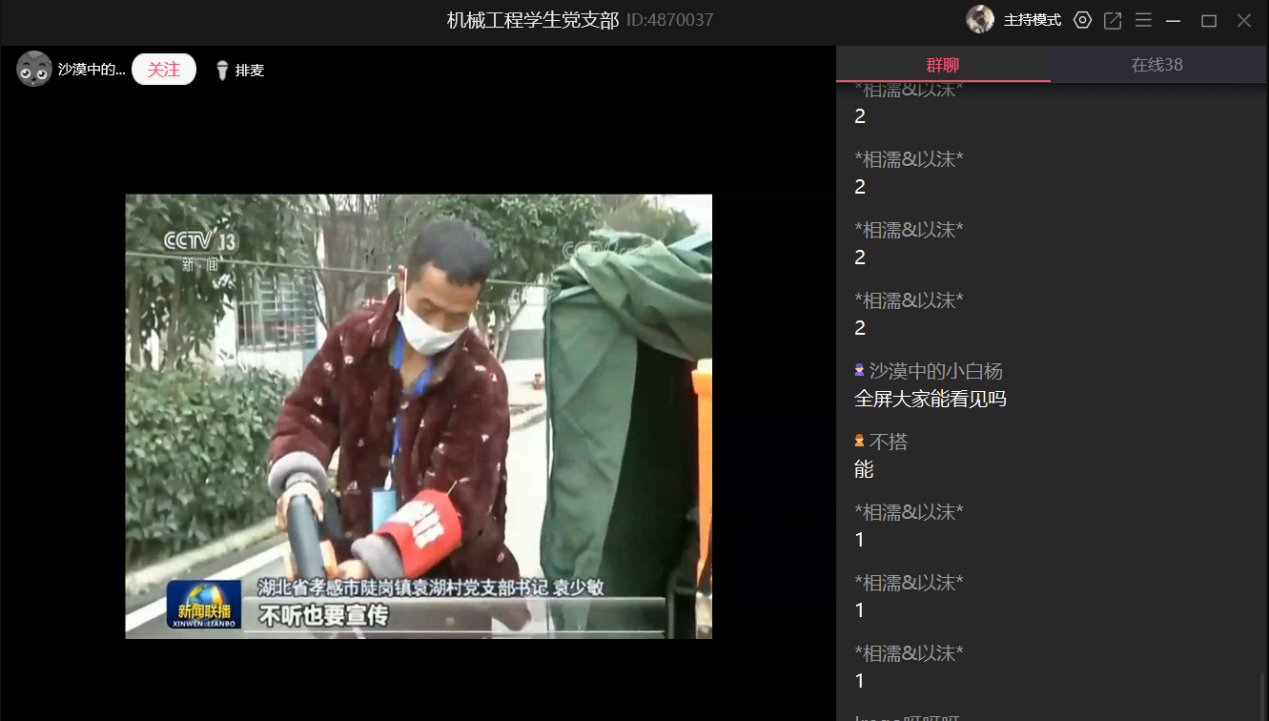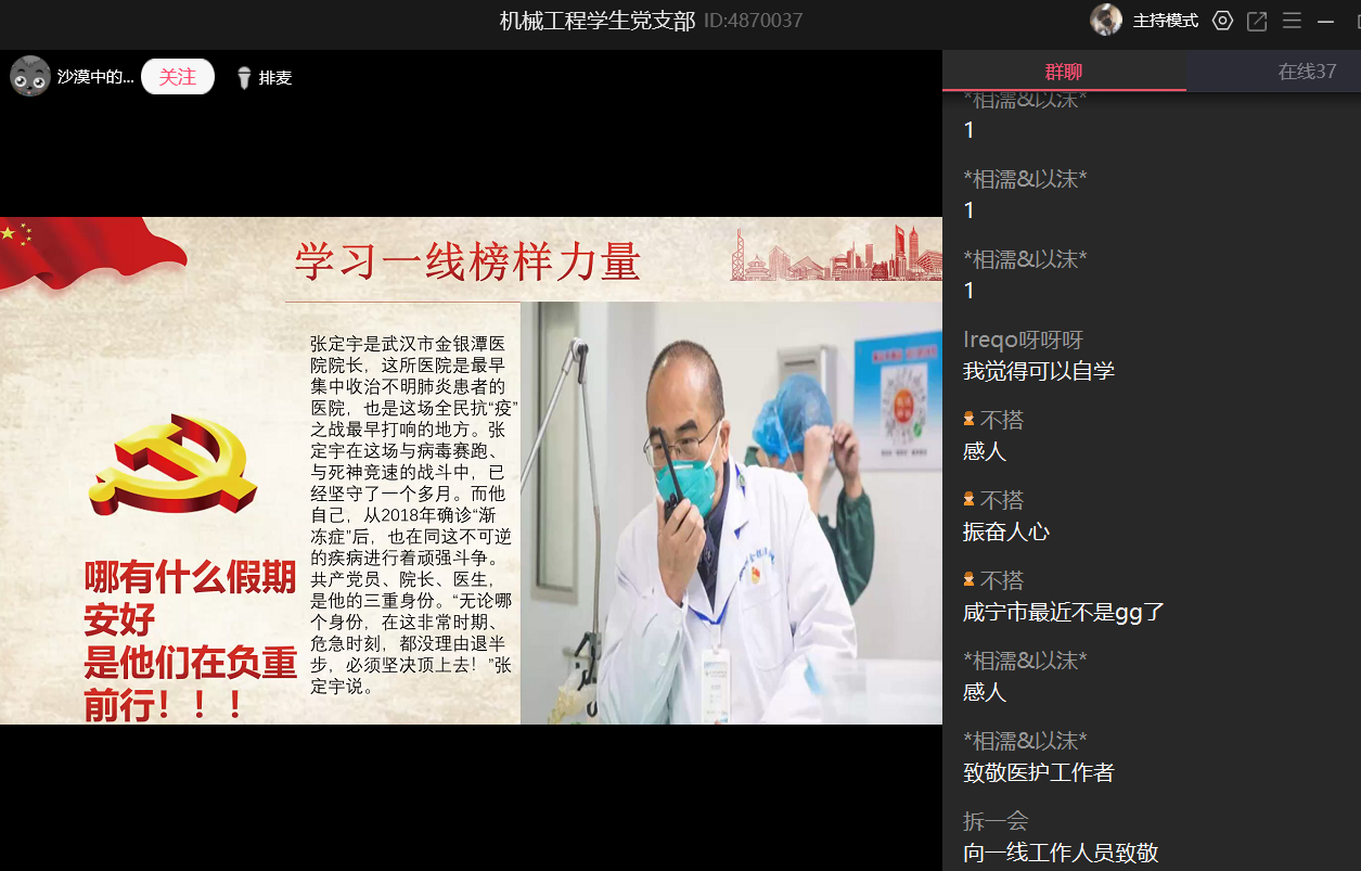 为坚决贯彻落实习近平总书记关于疫情防控工作的重要指示、批示精神和中共中央《关于加强党的领导、为打赢疫情防控阻击战提供坚强政治保证的通知》,2020年2月18日,机械工程学生党支部38位党员同志于腾讯平台以直播的方式进行了在线学习。