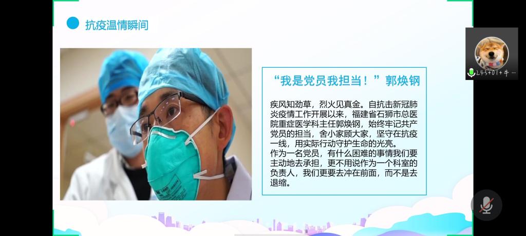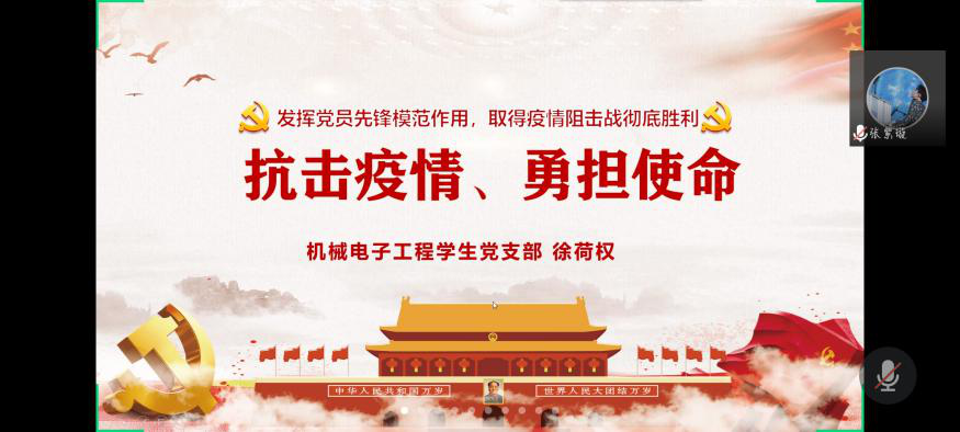 机械电子工程学生党支部于2020年7月2日上午9点30分以腾讯会议的形式举办了“抗击疫情、勇担使命”微党课的初赛。本次比赛由机械电子工程学生党支部书记王瀚雨主持,支部全体党员观看了此次比赛。