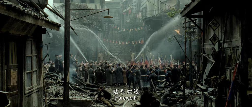 在日军刚刚轰炸过得城市,政府对于建筑的损失置之不顾,对人员的伤亡不予理睬,却不惜劳民伤财组织民众上街欢送高层外宾。残垣断埂处,人生鼎沸,重伤在废墟之上,临死耳畔响起的是“热烈欢送”,可悲,可恨。热烈欢送,熙熙攘攘的人群和轰炸后的废墟,电影的搭景堪称绝配。