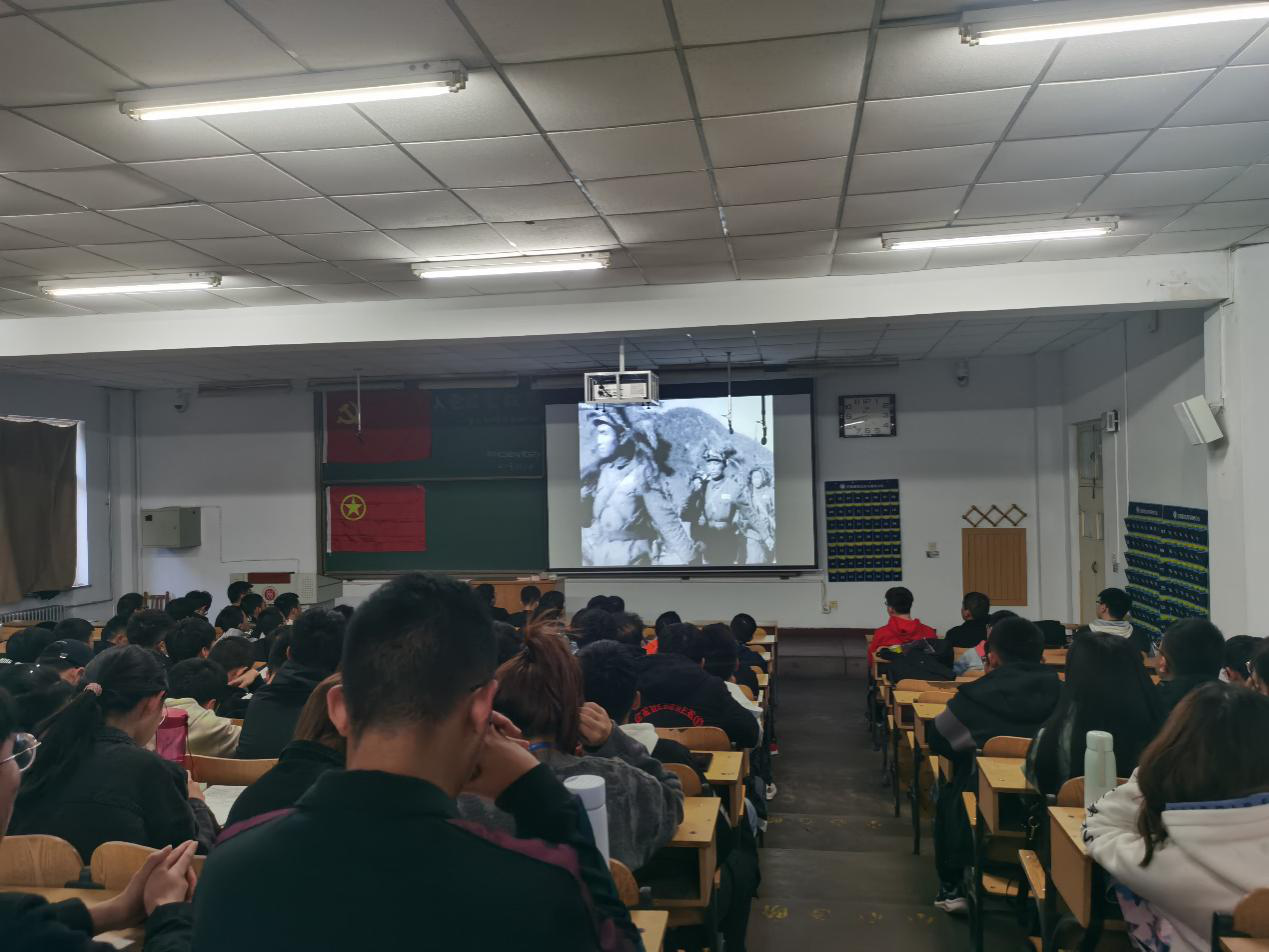 恰逢抗美援朝战争胜利70周年之际,支部随后组织新生和全体党员学习抗美援朝精神。70年前在抗美援朝战争中,志愿军涌现出杨根思、黄继光、邱少云等众多英雄模范和功臣。中国人民志愿军被称为“最可爱的人”,他们可歌可泣的英雄事迹汇成强大的民族凝聚力,创造了伟大的抗美援朝精神,极大地鼓舞着全国人民为保卫和建设祖国而团结奋斗。通过带领新生观看抗美援朝系列电影《上甘岭》,学习志愿军为了祖国和民族的尊严而奋不顾身的爱国主义精神,英勇顽强、舍生忘死的革命英雄主义精神,不畏艰难困苦、始终保持高昂士气的革命乐观主义精神,追思烈士,铭记历史,牢记历史责任,为建设社会主义事业而奋斗终身。