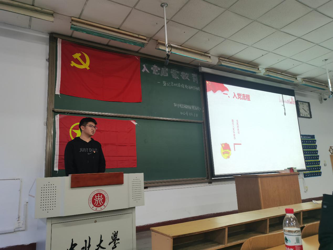 会议开始,支部副书记陈一平同志介绍机械工程学生党支部人员基本情况,介绍了支部的构成等等,陈一平同志分三个主题介绍了什么是中国共产党,为什么要加入中国共产党,以及入党流程,并详细对中国共产党,党史、现状和发展趋势进行讲解,让同学们对党的性质、宗旨、原则及党领导中国人民所取得的伟大成就有了初步了解,着重讲述树立正确入党动机的重要性,强调大学生加入中国共产党的重要意义,激发他们的入党热情,希望他们能够积极投身于共产主义伟大事业。