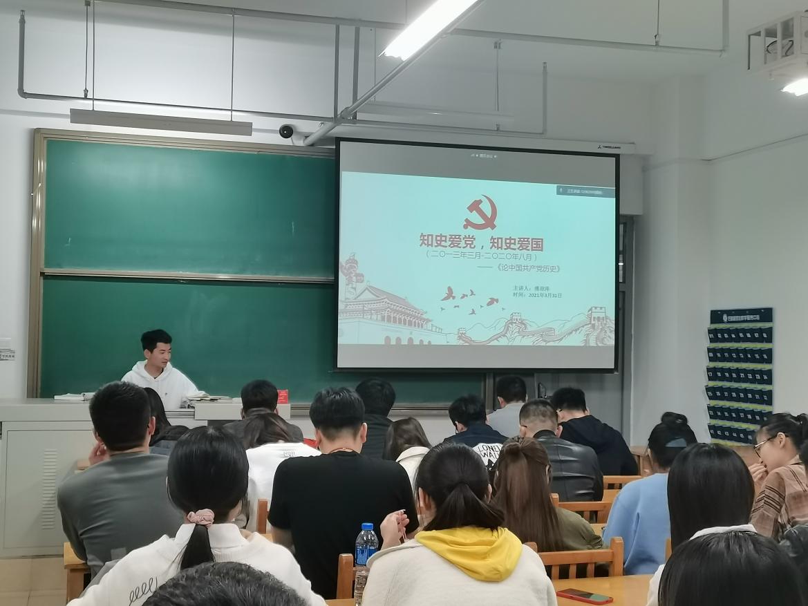 傅迎泽同志以“知史爱党,知史爱国”为主题,领读了习近平总书记在中央党校建校八十周年庆祝大会上的讲话。作为一名新时代的党员同志,我们更应该学习党史,体会先辈们的不易,从党史中汲取养分,做好自己的事情,争取未来有所贡献。郜冉同志以“为什么学习党史”为主题,提出我们应该“以史为镜”,反思自身不足,争做优秀党员,在新的征程中坚定信心、保持斗志、担当实干。同时,强调在座的每位同志继续坚持参与《全国大学生党史知识竞答大会》,以赛促学。