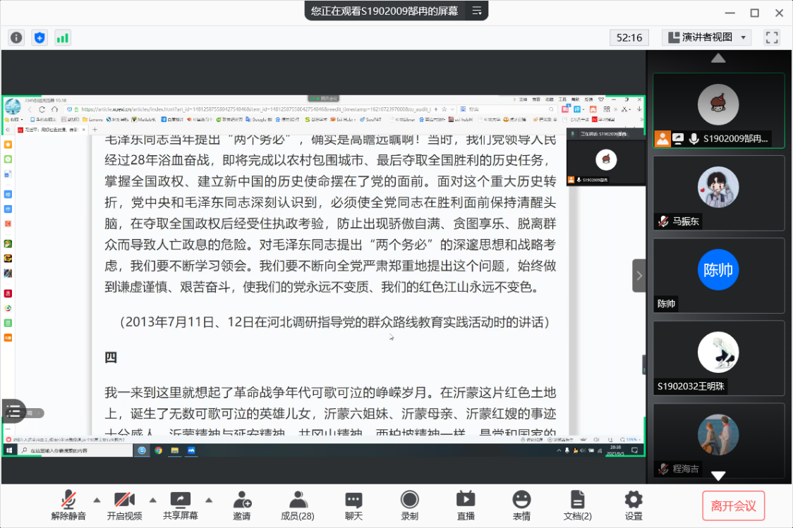在本次理论学习会上,每个人都秉承严肃、认真的态度去学习革命精神。通过本次学习会,同志们加强了对革命精神和老一辈革命家的认识。