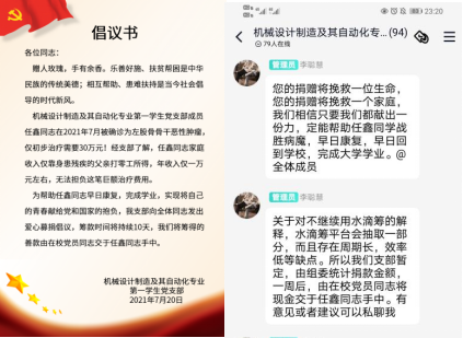 天有不测风云,人有旦夕祸福。在2021年暑假,机械设计制造及其自动化专业第一学生党支部任鑫同志被确诊为左股骨骨干恶性肿瘤,仅初步治疗需要30万元。2021年7月16日,机械设计制造及其自动化专业第一学生党支部发起了为任鑫同志募捐的倡议,号召大家伸出援手,献出爱心。