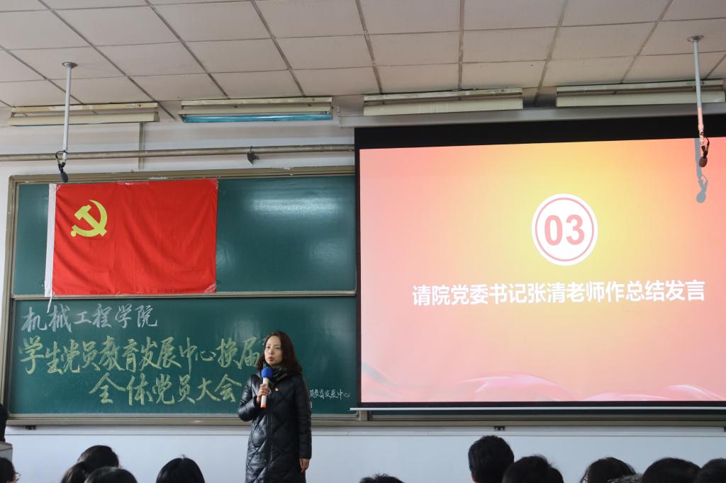 会议最后,院党委书记张清老师对会议进行了总结。她对一年来各党支部的工作给予了肯定,尤其是学生党员教育发展中心在实践服务和学习宣传工作上很好的发挥了桥梁作用。她指出,总结是为了更好地开始,在接下来的2022年,各位支部要通过对党建工作的总结,提升支部党建工作水平:本科生支部要考虑如何促进团学工作,如何发挥党支部的指导作用;研究生支部要思考如何在学科建设和科研工作中发挥党员的带头作用,如何担当社会责任;以及如何做好监督反馈工作,建立好的督察和反馈的机制。张书记的总结发言为各支部指出了前行的道路,相信各位党员同志在新的一年里,可以用高度的责任感和使命感,共同续写二院新篇章,让二院的党建工作更上一层楼。在热烈的掌声中,本次机械工程学院召开学生党员教育发展中心换届大会暨全体党员大会圆满结束。