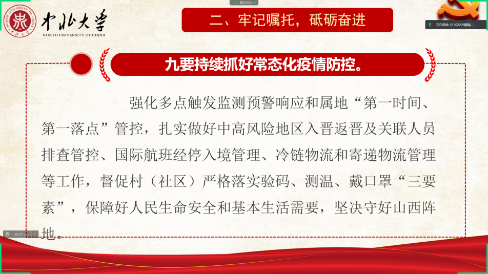 研究生第一党支部于2022年2月27日通过腾讯会议(180-450-334)开展了“学习贯彻习近平总书记考察调研山西重要指示精神”党日活动,支部全体党员共同参与学习研讨。
