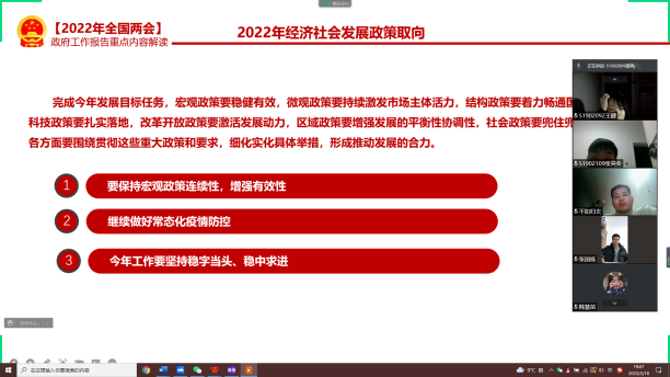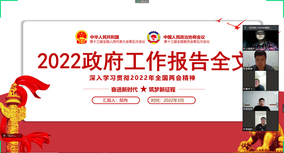 会上,郜冉同志就3月5日在京召开的”两会”进行了解读与学习,他从“两会”基本情况、2021政府工作回顾、2022年经济社会发展总体要求和政策取向等5个方面进行了深入讲解。他强调:作为新时代青年,我们要更加紧密地团结在以习近平同志为核心的党中央周围,高举中国特色社会主义伟大旗帜,以习近平新时代中国特色社会主义思想为指导,并以实际行动迎接党的二十大胜利召开,为实现社会主义现代化国家不懈奋斗,奉献个人力量,提升个人能力,成为一个对国家、社会、人民有用的新时代人才。
