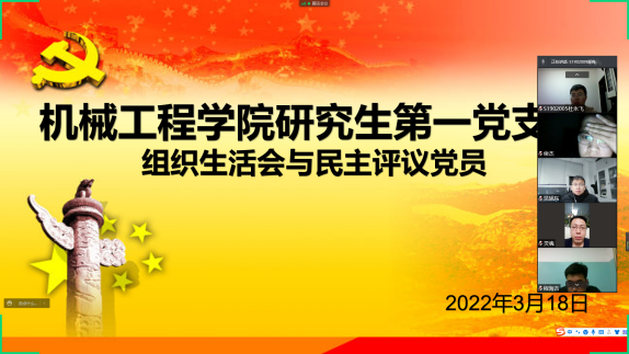 研究生第一党支部于2022年3月18日在腾讯会议(372-876-106)开展2021年度组织生活会和民主评议党员。本次会议由郜冉同志主持,支部全体党员参加会议。