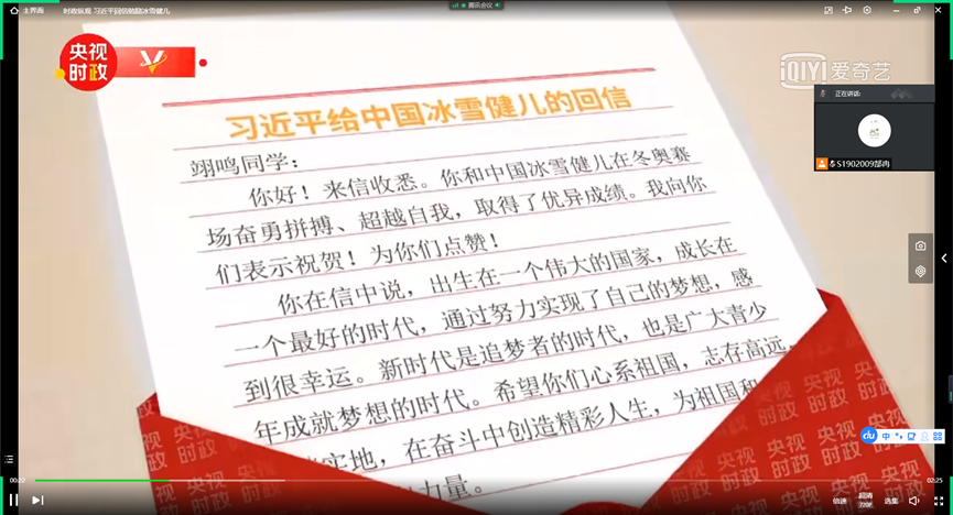 郜冉同志带领同志们学习了《习近平给中国冰雪健儿的回信》,对信中包含的精神进行讲解。从三个方面勉励支部的党员同志:坚持立德树人,加强爱国主义教育;坚持健康第一,深入推进体教融合;坚持以体育人,弘扬中华体育精神。郜冉同志说道:新时代是追梦者的时代,也是广大青少年成就梦想的时代。我们应该像运动健儿们学习,努力学习,在自己的领域发光发热,以一个崭新的姿态迎接党的二十大胜利召开。
