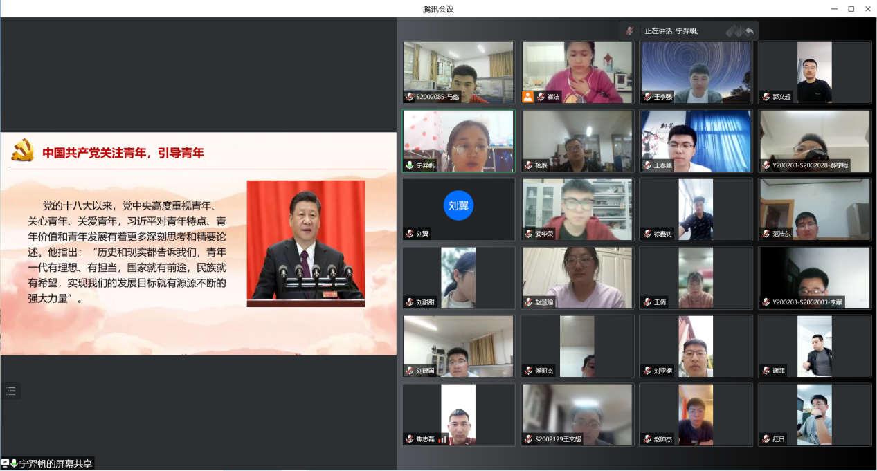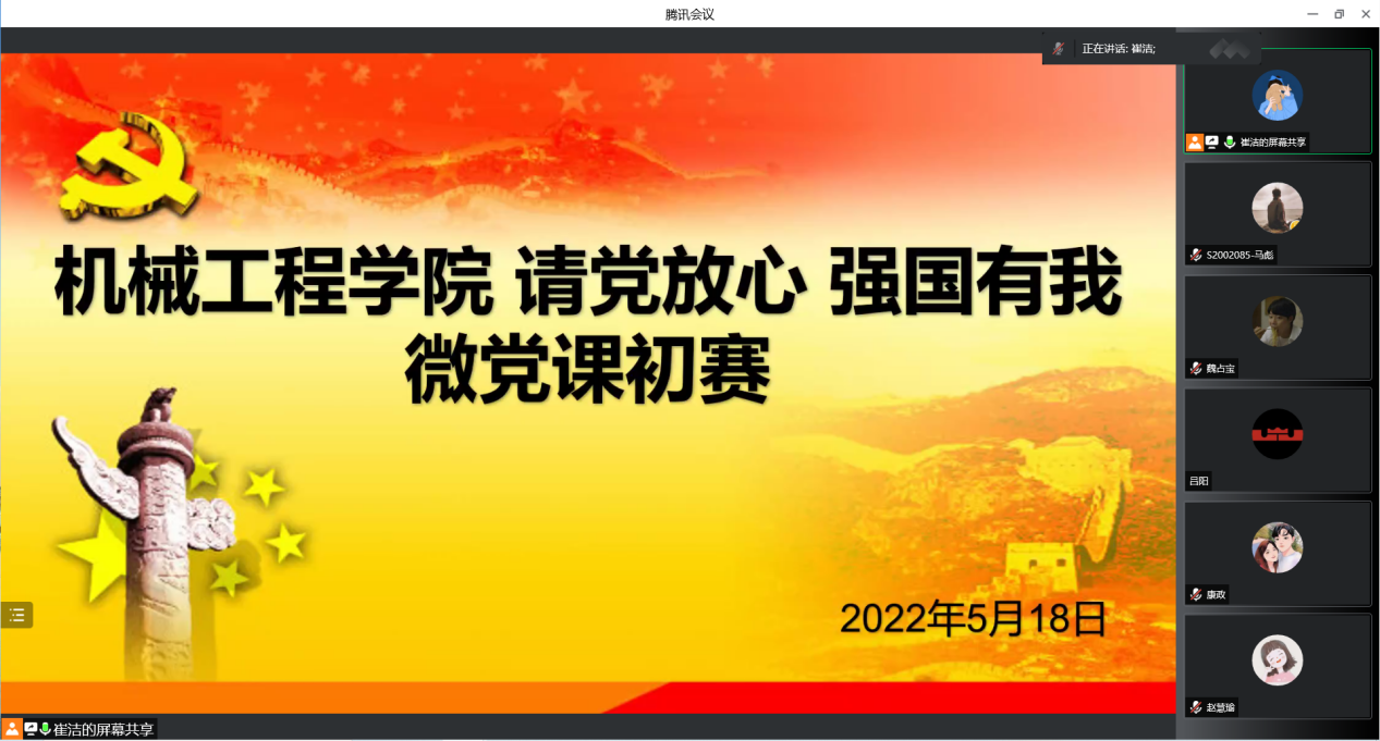 为激励和动员支部党员更加紧密地团结在以习近平总书记为核心的党中央周围,响应学院号召,机械工程学院研究生第二党支部于2022年5月18日19:00在腾讯会议开展了“请党放心,强国有我”微党课初赛活动,会议由第二党支部书记崔洁同志主持,研究生第二党支部全体党员参加了此次会议。