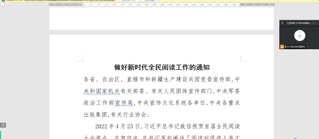 机械工程学院研究生第一党支部于2022年5月24日下午20:00以腾讯会议的形式召开了研究生第一党支部理论学习研讨会,本次会议主要学习了习近平总书记致首届全民阅读大会贺信精神。会议由支部书记郜冉主持,党支部全体党员、预备党员参加了此次会议。