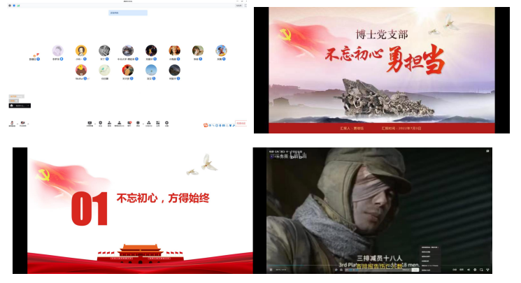 本次学习中,党支部通过主讲党课、重温入党誓词、优秀事迹分享、观看红色影片等活动纪念中国共产党成立101周年。贾增钰同志讲到:做坚定不移听党话、跟党走的“先锋队”。中国青年的奋斗目标和前行方向归结到一点,就是坚定不移听党话、跟党走,努力成长为堪当民族复兴重任的时代新人。我们党从诞生那一天起,就义无反顾地肩负起为中国人民谋幸福、为中华民族谋复兴的历史使命;做心系人民、服务人民的“好学生”。我们广大的大青年学子要尽早树立起“人民至上”的信念,建立起与人民群众的深厚情感,把自己的所思所学毫无保留地投入到服务人民的事业中去。