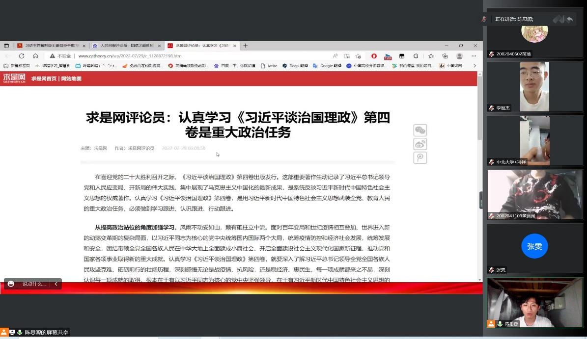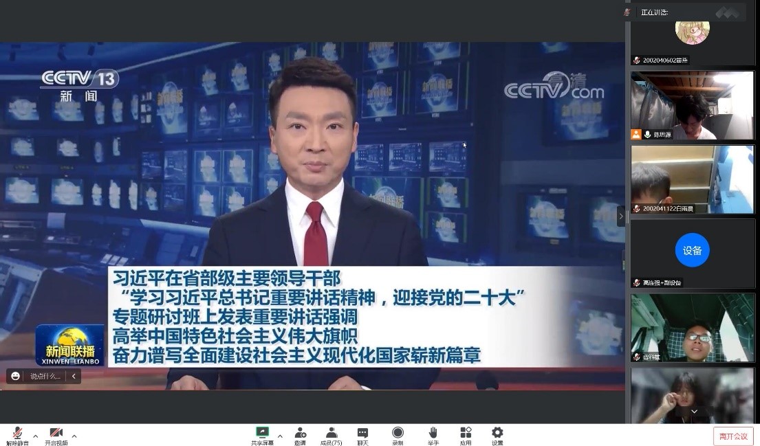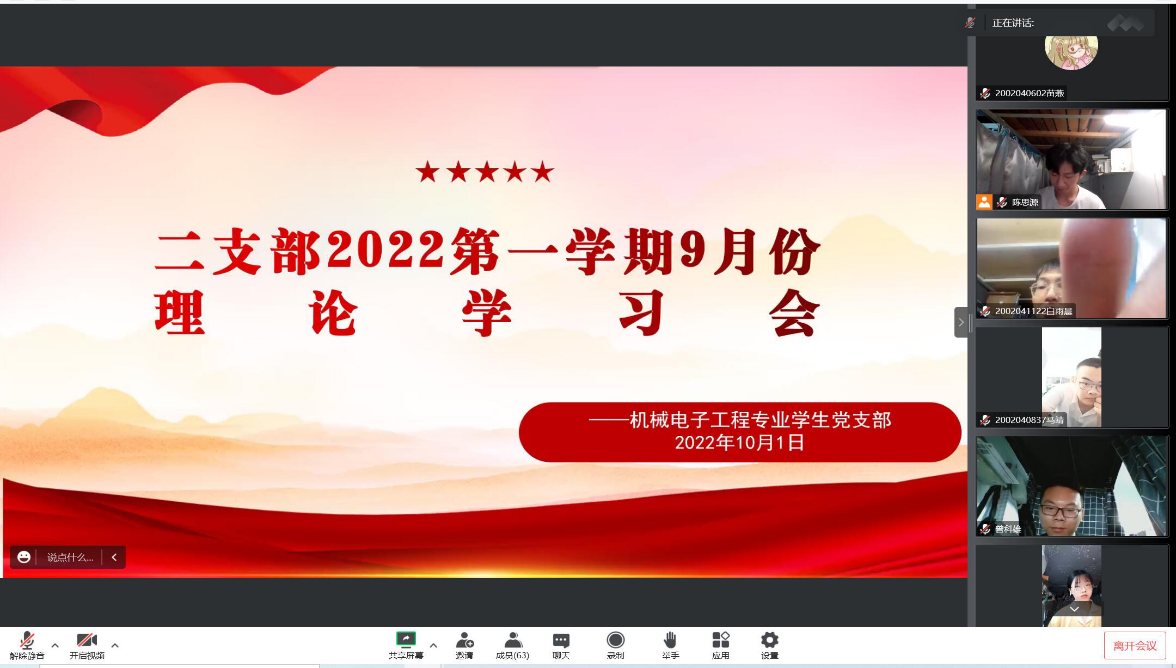 2022年9月29日下午19:10,机械电子工程专业学生党支部于线上开展理论学习会。党支部书记李宗霖老师、全体党员和发展对象参与了此次会议。会议由陈思源同志主持。