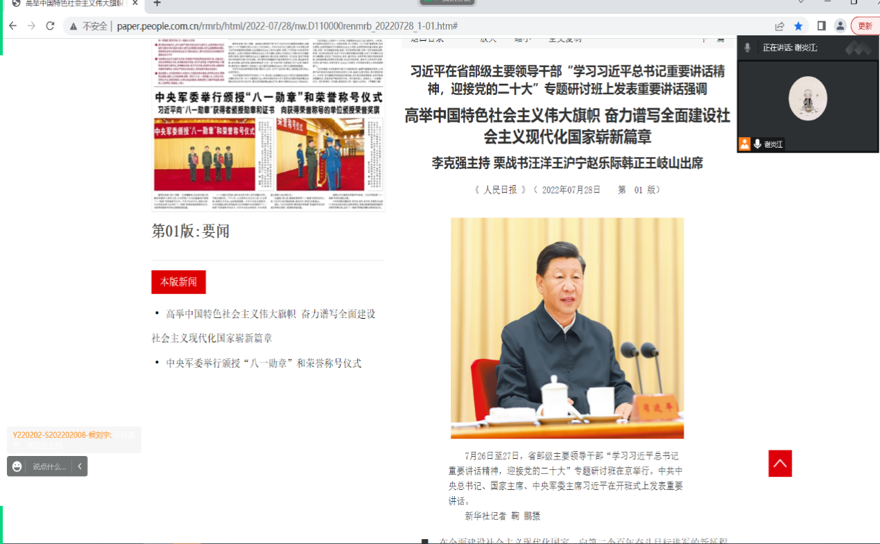 机械工程学院研究生第一党支部于2022年9月29日12点40时在线上召开了理论学习会,学习的主题为“学习习近平总书记重要讲话精神,迎接党的二十大”。本次会议由谢炎江同志主持,谢炎江同志主讲,研究生第一党支部全体党员参加了此次会议。