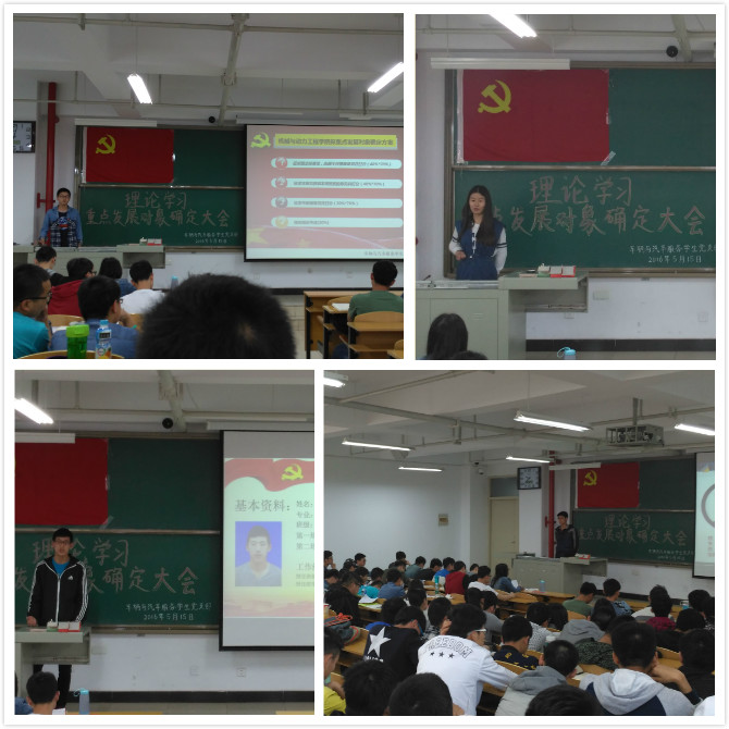 2015年5月15日上午,车辆与汽车服务学生党支部在15106召开理论学习会暨重点发展对象确定大会,参加本次会议的有支部所有党员同志、本批发展对象及往期发展对象以及近两期入党积极分子。