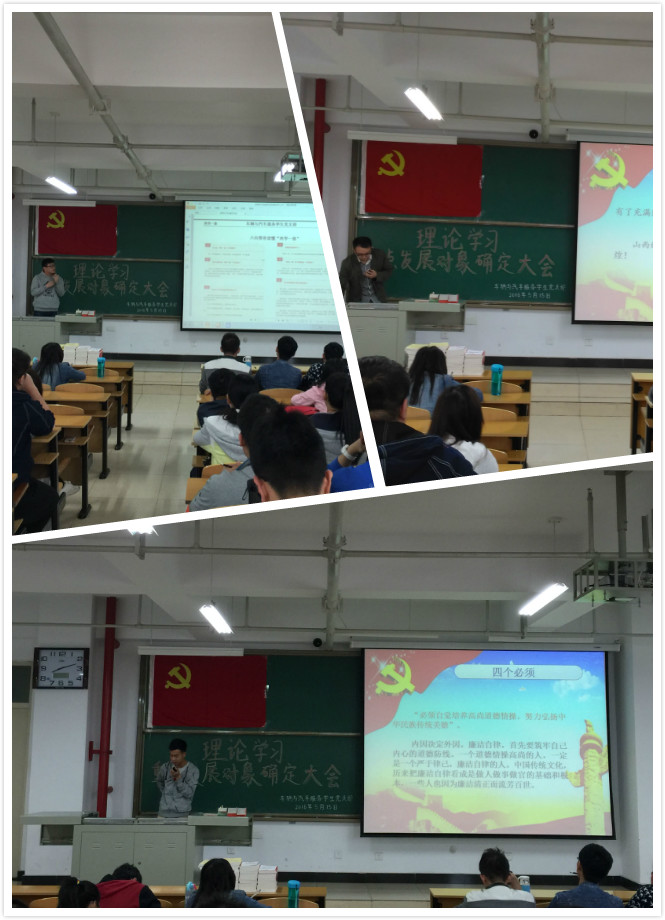 最后进行的一项重要内容是重点发展对象确定大会,本批发展对象和往期遗留对象总计16人分别通过PPT和口头陈述的形式向党组织说明自己的情况,支部所有同志针对他们发展以来的表现进行点评同时给出相应的意见。与此同时,支部各支委、发展对象考察小组组长、各班党员本着公平公正的原则对每一位发展对象的表现进行打分。