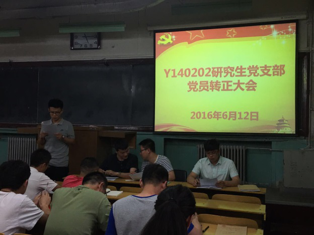 按照机械与动力工程学院党委相关要求,Y140202研究生党支部于2016年6月12日下午在工字楼101教室举行了本党支部转正转预大会及民主生活会,院党建办公室王瑞倩同志参加了此次大会。