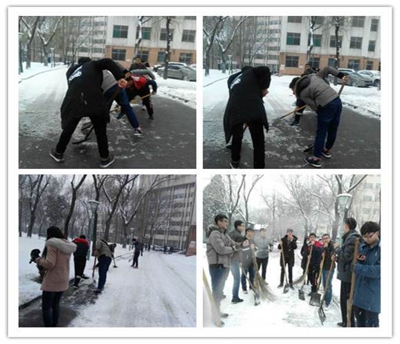 2017年2月21日上午,白雪覆盖了整个校园,为尽快消除积雪给学校道路交通带来的诸多不便,机械电子学生党支部的党员们本着服务他人的理念,开展了“扫雪暖心”的活动,对校园内15号教学楼至7号教学楼道路上的积雪进行了清理。