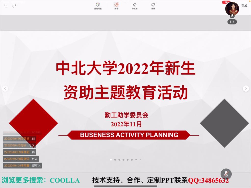 会议第一部分,资助政策讲解。王慧慧老师详细介绍了中北大学资助育人政策并对有可能涉及到的问题和相关注意事项进行了重点讲解,让同学们系统的了解了党和国家兜底暖心政策,准确传达了国家和学校的政策内容。王慧慧老师还鼓励同学们在大学开始就要树立明确的目标,怀着感恩的心态努力锤炼本领,学有所成、报效祖国。