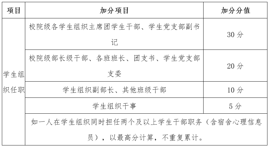 学生组织任职指在校院班级担任学生干部,担任工作满一年具备加分条件,具体分值如下: