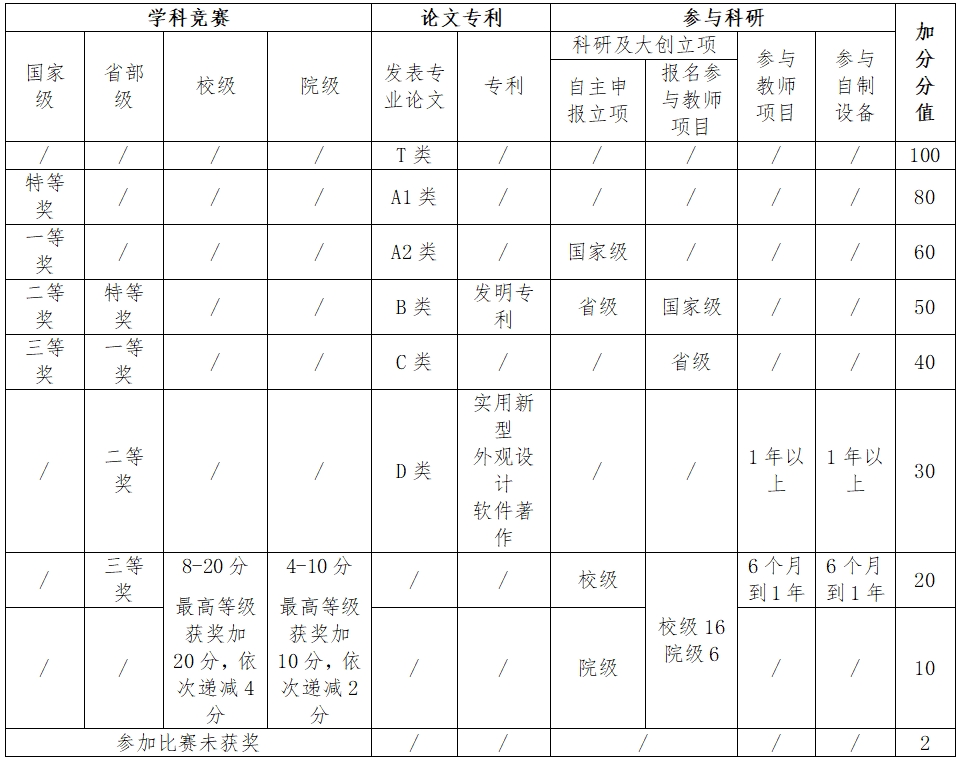 3)学生参与科创活动中,如主持一项,参与一项,可累加;如两项均为参与,只计最高分。参与老师的项目必须由老师出具书面证明材料。