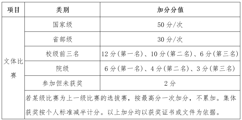 1、参加文艺、体育比赛获奖,依据获奖等级计分,具体分值如下: