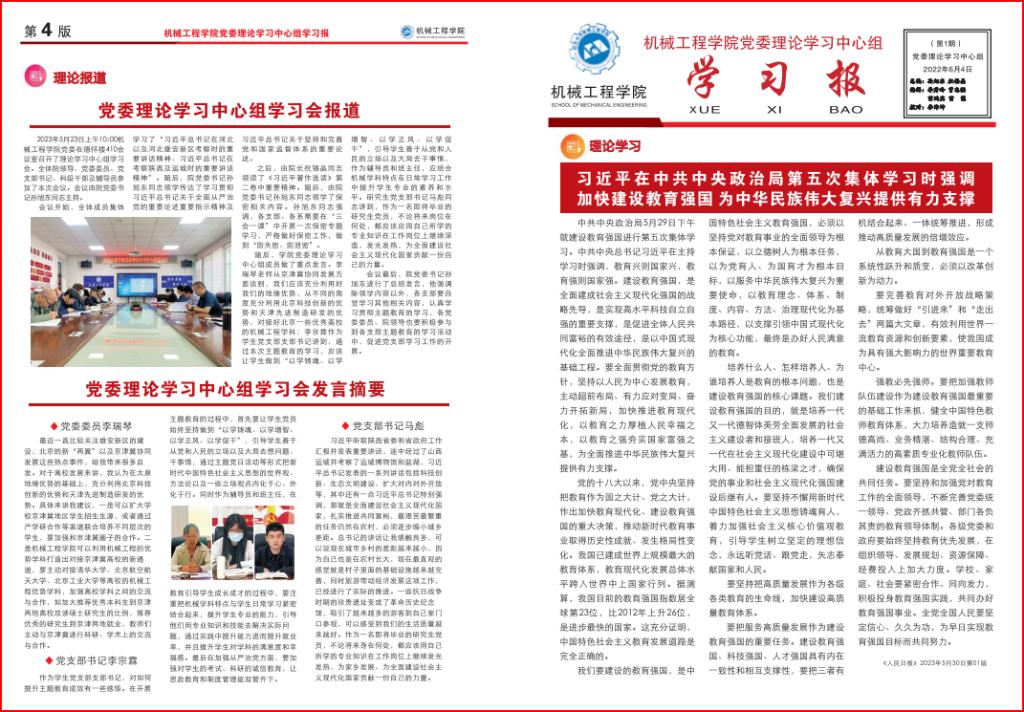 机械工程学院党委利用“机械工程学院党委理论学习中心组学习报”作为载体,传递主题教育最新学习内容,确保学习不掉队;还创新性开设“党委理论学习中心组学习会发言摘要”板块,供党员掌上学、随身学,在理论学习中做到在干中学,在学中干。